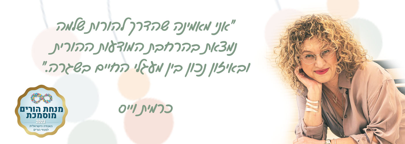 בעבר, כאמא צעירה הרגשתי שחסרים לי ידע וכלים. קריאה בגוגל, התייעצות עם ההורים או חברים לא השלימו לי את הפערים. בחרתי ללכת ללמוד את התחום לקבל ידע וכלים ולהיות אמא מבינה, מעורבת ובטוחה בעצמה שיודעת מה היא עושה. מקורס בסיסי אחד המשכתי לתכנית לימודים מלאה. השלמתי התמחויות והעשרתי את ארגז הכלים לליווי ותמיכה בהורים שרוצים לדעת יותר ולקבל כלים והכוונה להורות מודעת שלמה ונכונה עבורם.